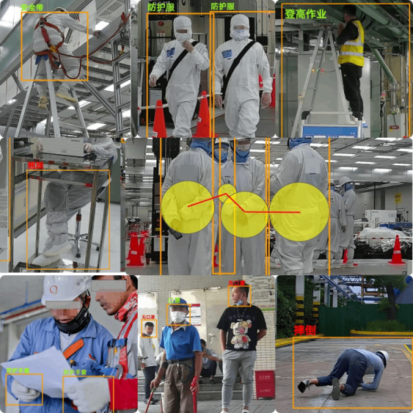 旗晟智能檢測算法基于行業(yè)大數(shù)據(jù)庫積累以及自研AI深度學(xué)習算法模型,可以對安全帶、安全帽、安全馬甲等監(jiān)測、防護服、防護手套、防護面罩、口罩、護目鏡等佩戴監(jiān)測、登高作業(yè) 監(jiān)測、翹腿、奔跑、摔倒、趴地、坐地、人員聚眾等監(jiān)測!